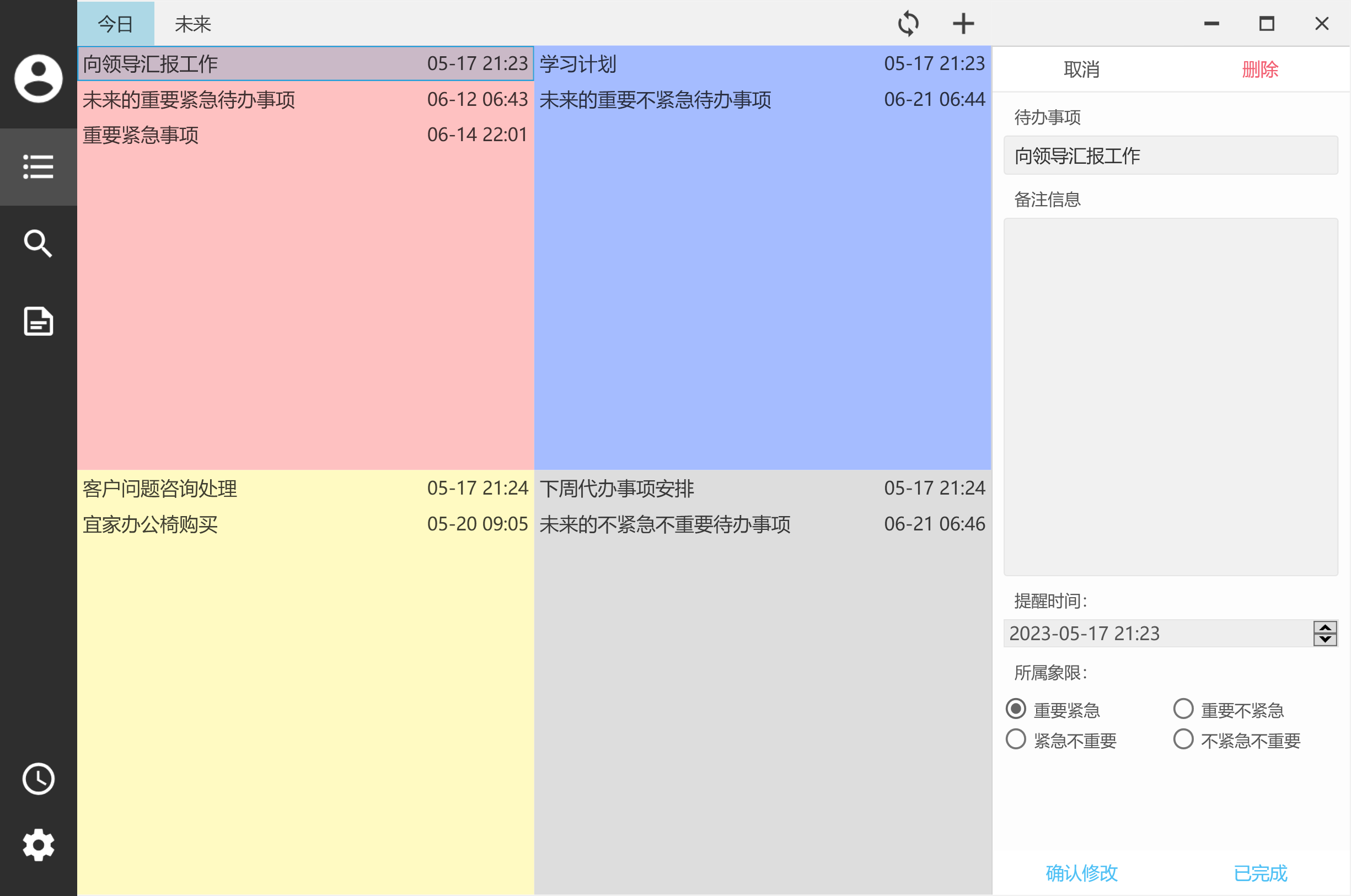 是一款利用四象限法则的时间管理软件。把工作按重要、紧急两个维度的不同程度进行划分,以合理的优先级高效的管理时间,从而完成工作与生活中最重要的事情。